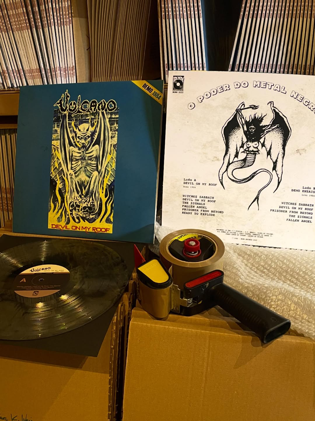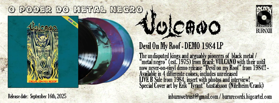 “The undisputed kings and arguably pioneers of black metal / “metal negro” (est. 1975) from Brazil: VULCANO with their until now never-on-vinyl demo release “Devil on my Roof” from 1984!! A milestone of uncompromising dark & heavy metal, exclusively for die-hard fans of Venom, Iron Maiden and…Vulcano!